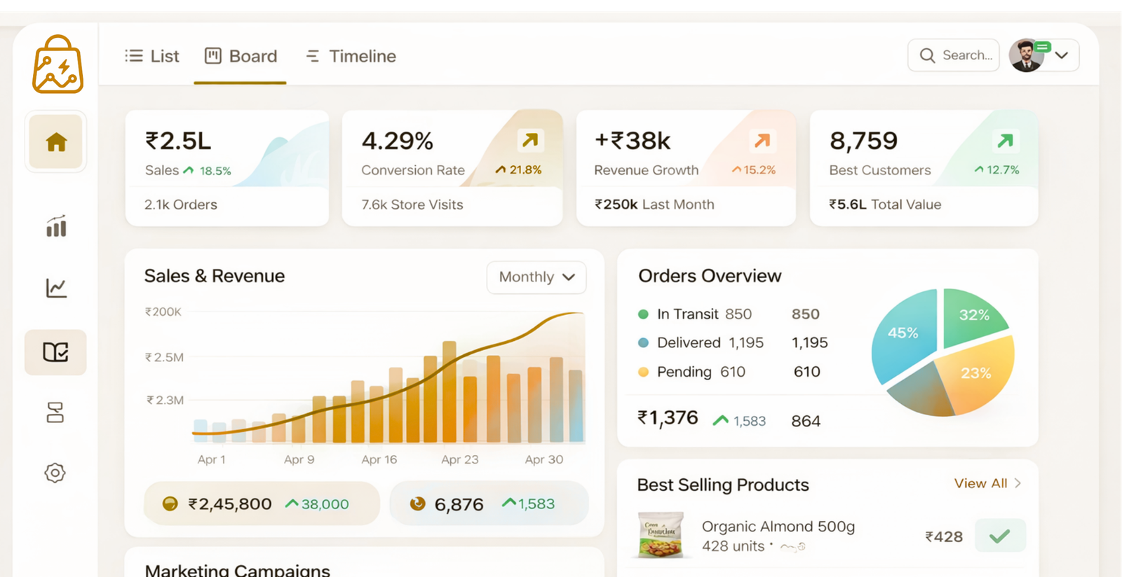 Monitor sales performance, customer behavior, order trends, and marketing ROI all from one intelligent dashboard.